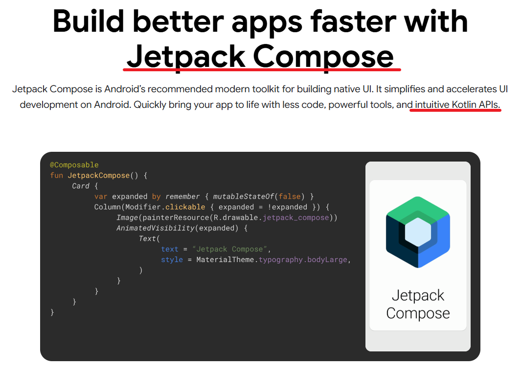 Jetpack Compose is Android's recommended modern toolkit for building native UI. It simplifies and accelerates UI development on Android. Quickly bring your app to life with less code, powerful tools, and intuitive Kotlin APIs.
