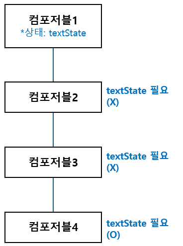 앞에서 부모 컴포저블에서 정의한 상태는 자식 컴포저블로 전파된다고 했는데, 아래와 같은 상황을 가정해보자. 컴포저블1에서 정의한 상태값(textState)을 모든 자식 컴포저블이 필요한것이 아니라, 컴포저블4만 필요로 하는 경우이다. 상태값을 필요로 하지 않는 컴포저블2, 3에도 상태값이 전파되는 문제가 발생한다.