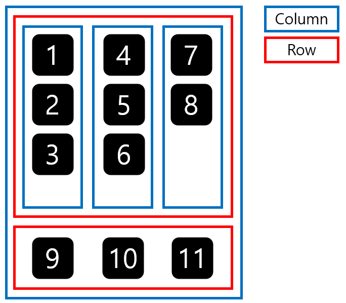 이번에는 버튼, 이미지, 텍스트 자체가 아니라, 이러한 UI 컴포넌트들을 화면에 "배치"하는 방법에 대해 알아본다. 챕터의 제목을 보고 유추할 수 있듯이 행(Row)과 열(Column) 컴포저블을 사용하여 UI 컴포넌트들을 화면에 원하는 형태로 배치할 것이다. 자세한 내용은 아래에서 설명하겠지만, 결론부터 얘기하면 Row 컴포저블은 UI 컴포넌트들을 가로방향으로 배치한다. 반대로 Column 컴포저블은 내부의 UI 컴포넌트들을 세로방향으로 배치한다. Row와 Column을 조합하면 UI 컴포넌트를 원하는대로 배치할수 있다.