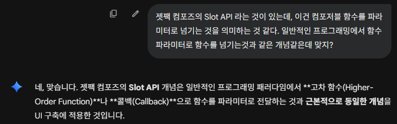 이름이 Slot API 라서 생소할뿐, 일반적인 프로그래밍에서 함수를 인자로 넘기는 것을 생각하면 된다. 이 함수가 컴포저블 함수인것 뿐이다. Gemini 에 더블체크를 해보았다.
