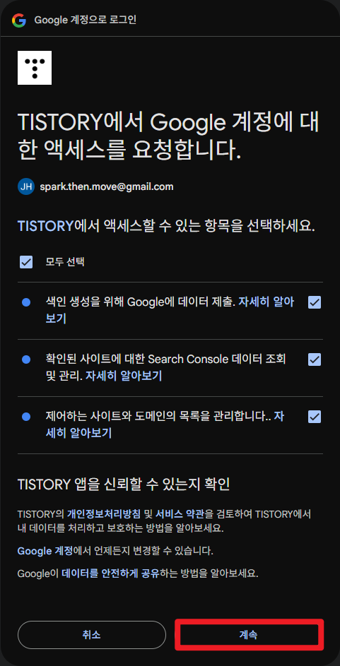 그리고 본인의 Gmail 계정을 선택하고 계속, 계속을 클릭한다. (아래화면 참고) 그리고 연결되었다는 팝업이 뜨면 완료된 것이다.