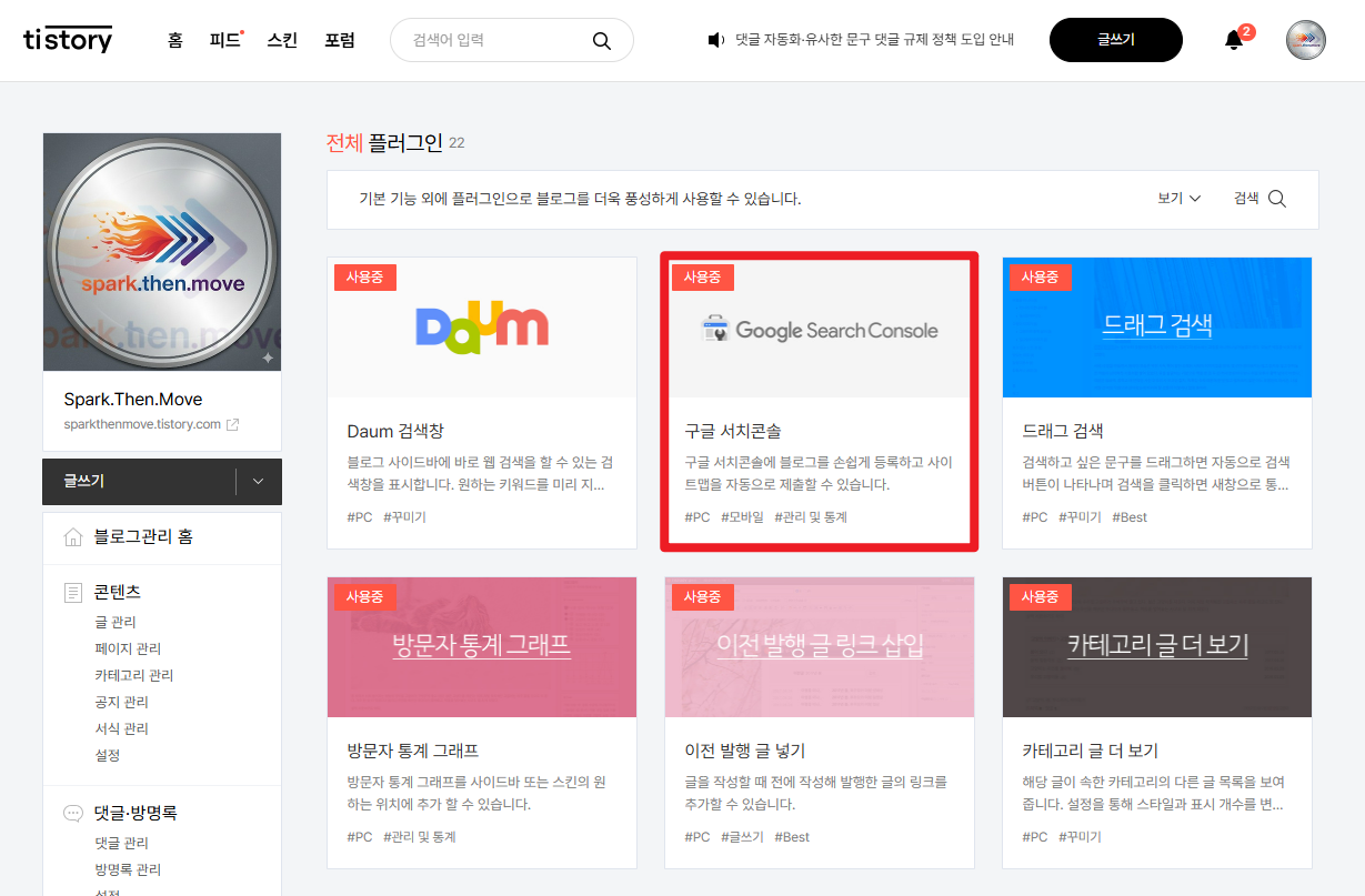 티스토리 플러그인 화면에서는 "구글 서치콘솔" 플러그인을 사용중이라는 것을 확인할 수 있다.