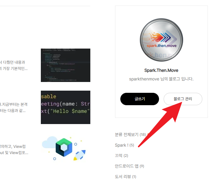 먼저 티스토리 블로그의 '블로그 관리' 메뉴화면을 들어간다. 나의 경우 아래와 같이 블로그 메인화면의 우측에 블로그 관리화면으로 진입할수 있는 버튼이 있다. 클릭!