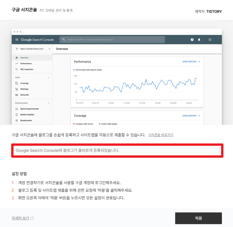 아래와 같이 "Google Search Console 에 블로그가 올바르게 등록되었습니다." 라는 문구를 확인할 수 있다. "적용"버튼을 클릭하면 구글 서치콘솔에 나의 블로그가 등록된다.