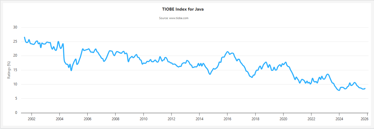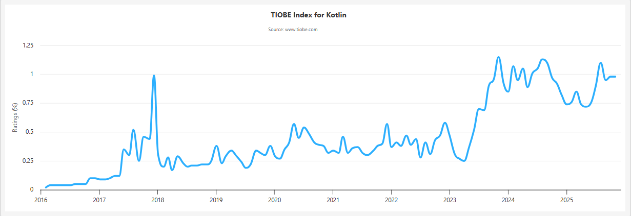 아래는 PYPL 2025 순위인데, 자바(Java)가 2위, 코틀린(Kotlin)이 14위를 차지했습니다. 자바는 안드로이드 앱 개발 뿐만 아니라 다양한 분야의 대규모 백엔드 언어로 널리 사용되고 있습니다. 취업을 위해 프로그래밍 언어를 배운다고 가정하면, 시장에서 널리쓰이는 언어를 배우는 것이 도움이 되겠지요. 이런 관점이 반영된것이 아닐까 생각됩니다. 코틀린은 자바에 비교했을때 점유율(Share)이 미비한 수준(1.14%)입니다. 현실적으로 안드로이드 앱 개발에 대한 점유율자체가 낮거나, 기존에 개발된 앱의 유지보수를 위해서는 코틀린보다는 자바가 더 나은 선택지일 수 있습니다.